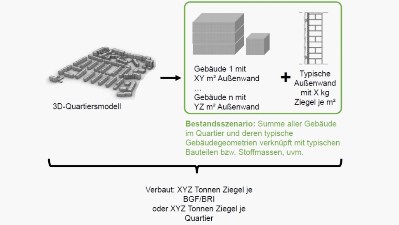 Um Strategien zur Umsetzung und Etablierung eines nachhaltigen und zukunftsorientierten Stoffstrommanagements (Urban Mining, Deponiemanagement, Abfallmanagement usw.) in Bayern zu entwickeln, muss in einem ersten Schritt die stoffliche Zusammensetzung des Gebäudebestands großflächig erhoben werden. Deshalb werden im Rahmen des Projekts die Machbarkeit einer flächendeckenden Kartierung des anthropogenen Lagers, insbesondere der verbauten Stoffe im Wohngebäudebestand in Bayern, und die daraus zu erwartenden Materialströme untersucht. Dies bedeutet, dass eine Schnittstelle geschaffen wird, um typische Materialkennwerte mit repräsentativen 3D-Gebäudemodellen zu verknüpfen, damit in einem weiteren Schritt großflächige Hochrechnungen durchgeführt werden können. Darüber hinaus trägt diese Studie dazu bei, dass alle für eine Rohstoffkartierung erforderlichen Gebäudedaten definiert werden und so eine Grundlage für eine bayern-weit einheitliche Datenerhebung geschaffen wird.