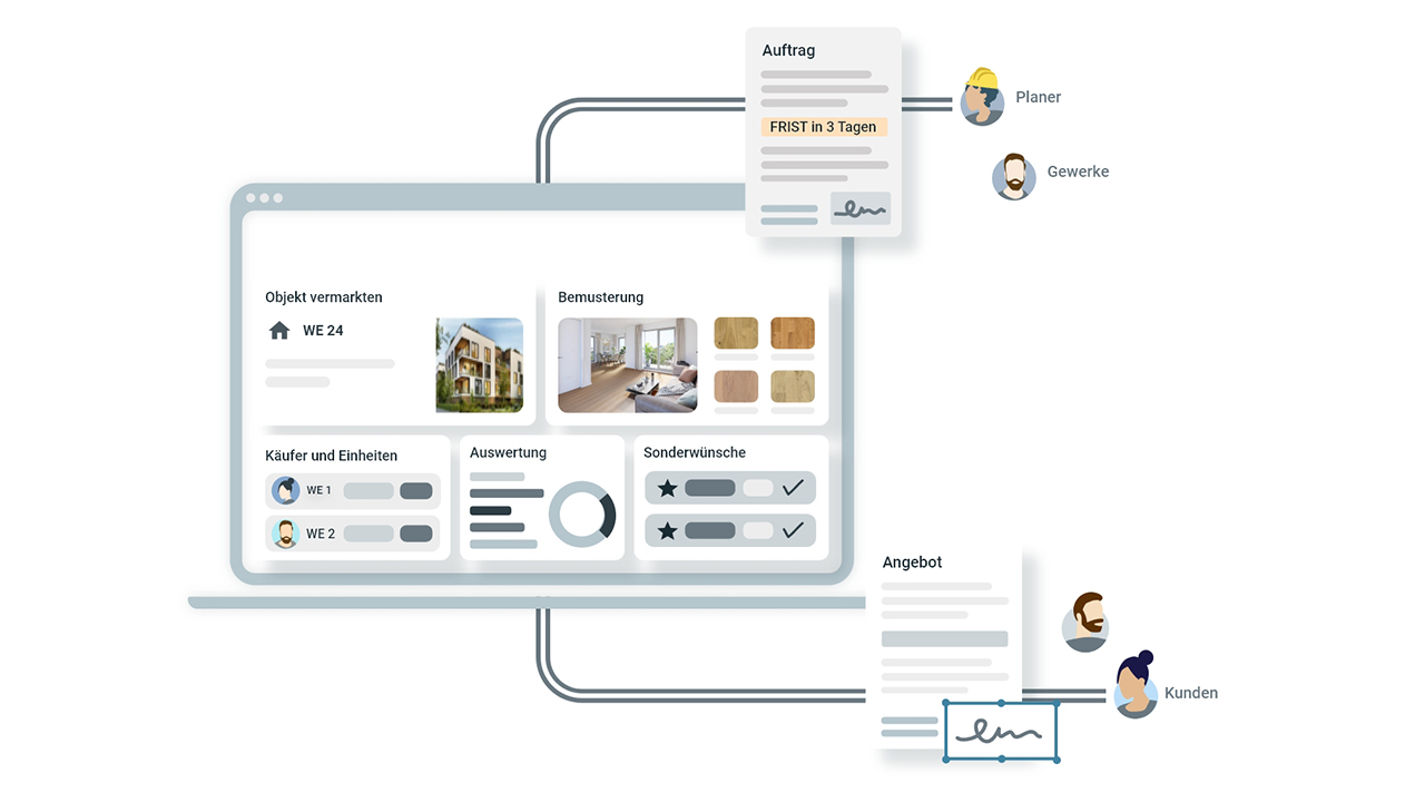 Alle Projektbeteiligten, egal ob aus Vertriebs- oder Projektleitung, Umsetzung oder Planung werden zur Konfiguration, Kollaboration und zum Dokumentenaustausch auf einer Cloud-Plattform miteinander verbunden. reINVENT sammelt Protokolle, Machbarkeitsanfragen, Angebote und Rechnungen an einem Ort – digital unterzeichnet und jederzeit für alle Beteiligten nachzuverfolgen. Dadurch werden pro Wohneinheit 15 Arbeitsstunden gespart und Sonderwunsch-Prozesse werden um bis zu 70 Prozent beschleunigt.