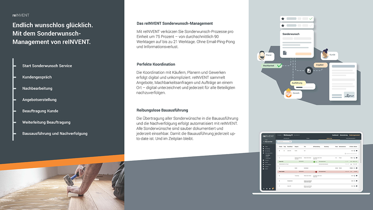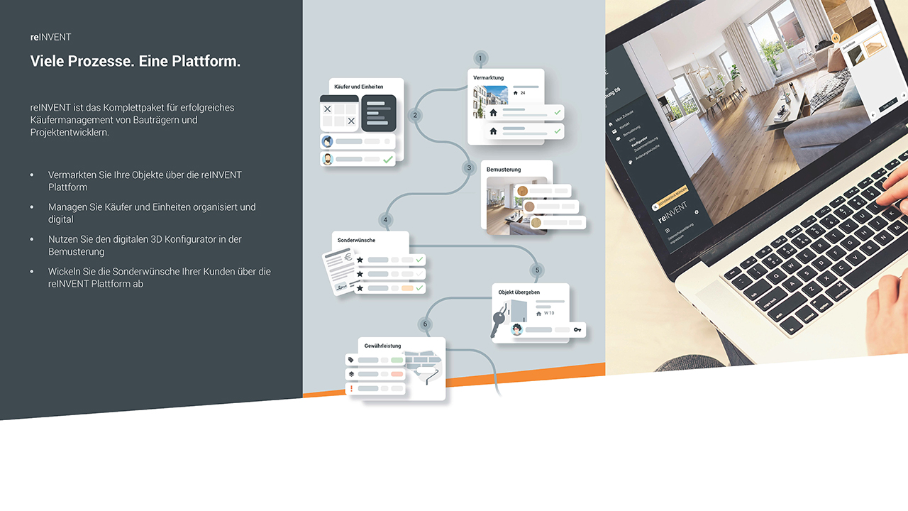 reINVENT ist das Komplettpaket für erfolgreiches Käufer- und Einheitenmanagement für Bauträger und Projektentwickler. reINVENT wickelt die gesamte Customer Journey von der Vermarktung über die Bemusterung und das Sonderwunsch-Management bis hin zur Übergabe auf einer Plattform ab.
