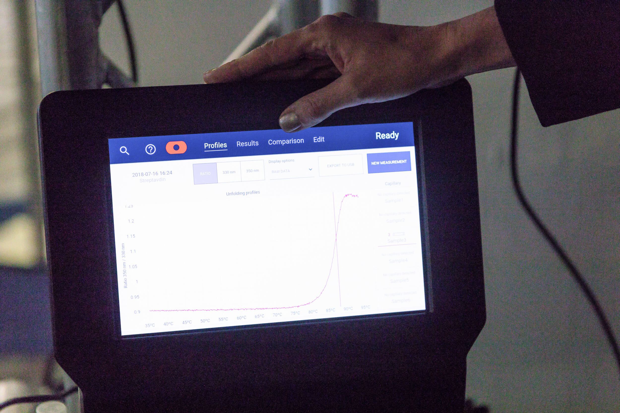 Biotechnologisch hergestellte Medikamente wie das Krebsmedikament Herceptin® sind eine der vielversprechendsten Wirkstoffklassen in der Medizin. Diese auch Biopharmazeutika oder Biologicals genannten Biomoleküle sind bis zu 1000-mal komplexer als herkömmliche Medikamente wie zum Beispiel Aspirin®. Es sind deswegen neue Verfahren und physikalische Messmethoden notwendig, um diese Biomoleküle zu entwickeln und bei deren Herstellung die Qualität zu überwachen. Für diesen Anwendungsbereich hat die NanoTemper Technologies GmbH das Labormessgerät Tycho® NT.6 entwickelt. Im Tycho® NT.6 wird ein innovatives nano-optisches Messverfahren eingesetzt, um in einem Schritt die Qualität dieser hochkomplexen Biopharmazeutika zu untersuchen. Mit einem winzigen, nur wenige Mikroliter großen Tropfen der Probe erfahren die Forscher innerhalb drei Minuten, ob ein vorliegendes Biopharmazeutikum ihren Erwartungen entspricht. Dabei wird der Forscher von einer intelligenten Software des Messgeräts unterstützt, die über einen sog. „Similarity Index“ unterschiedliche Moleküle miteinander vergleicht. Auf einen Blick kann der Forscher z. B. ein originales Biopharmazeutikum mit seiner Kopie, einem Biosimilar, vergleichen und auch voneinander unterscheiden. Derzeit wird der Tycho® NT.6 noch hauptsächlich im Bereich der Medikamentenforschung und Formulierungsentwicklung eingesetzt. Geringer Probeverbrauch, schnelle Messungen, intelligente Software und leichte Bedienbarkeit ermöglichen den Forschern, sich auf ihre Berufung, die Entwicklung von hochwertigen Medikamenten, zu konzentrieren.
