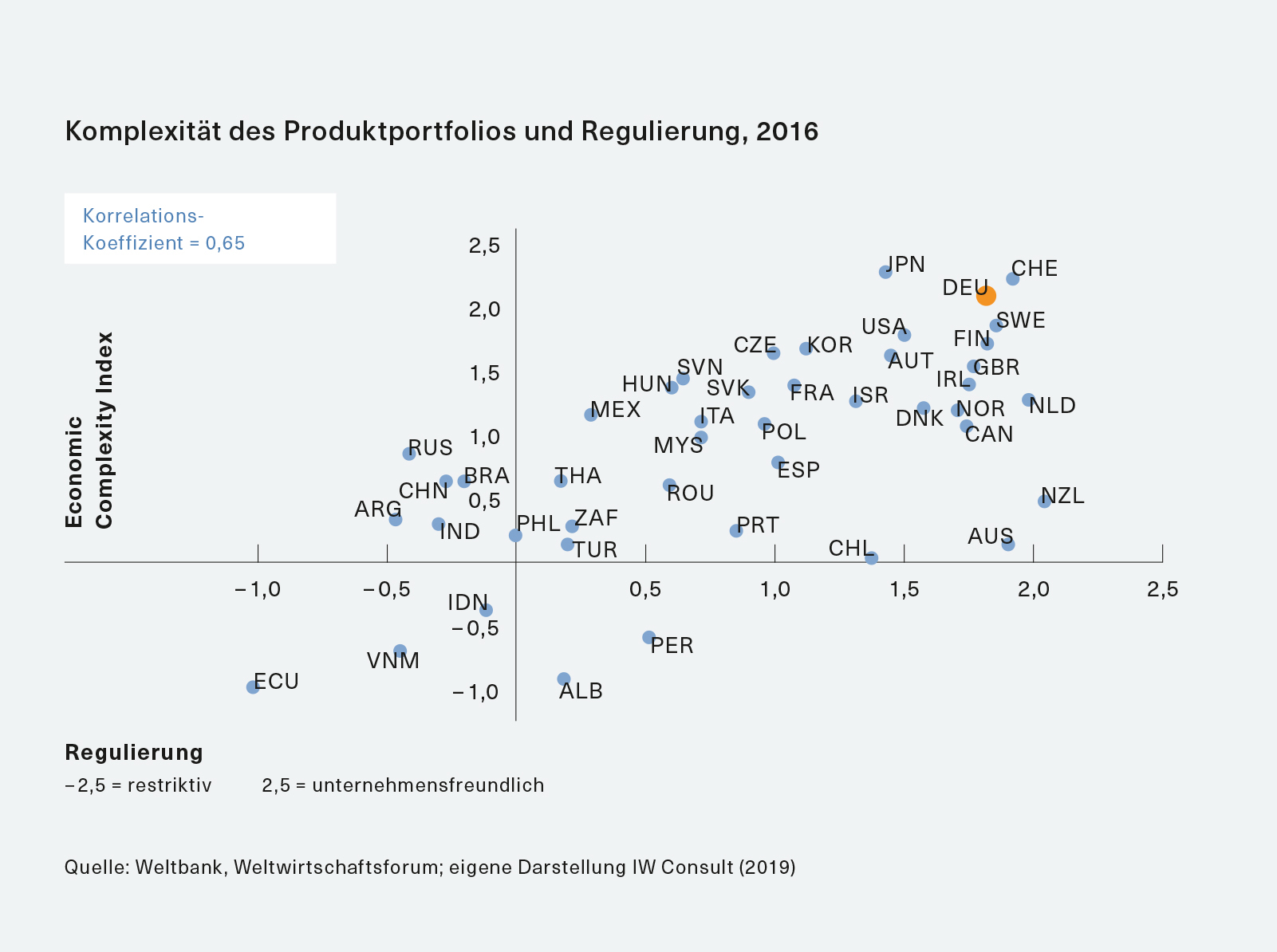 Regulierung hat einen messbaren Einfluss auf die Innovationsfähigkeit des Standorts. Vergleicht man das Regulierungsumfeld und die wirtschaftliche Komplexität, zeigt sich ein positiver Zusammenhang: Unternehmensfreundliche Regulierung geht tendenziell mit einem innovativeren, komplexeren Produktportfolio einher. Deutschland – in der Abbildung mit einem orangefarbenen Punkt markiert – zeichnet sich sowohl durch eine vergleichsweise „gute“ Regulierung als auch durch eine hohe Komplexität des Produktportfolios aus. Der relativ hohe unternehmensfreundliche Wert bei der Regulierung – der sich auch in anderen Indizes wie dem Regulatory Quality Index der Weltbank bestätigt – überrascht angesichts der oftmals geäußerten Kritik an überzogener Bürokratie auf den ersten Blick. Er lässt sich allerdings damit erklären, dass Faktoren wie die politische Stabilität, ein verlässliches Rechtssystem und eine im weltweiten Vergleich niedrige Korruption als maßgebliche Kriterien in den Indikator einfließen.