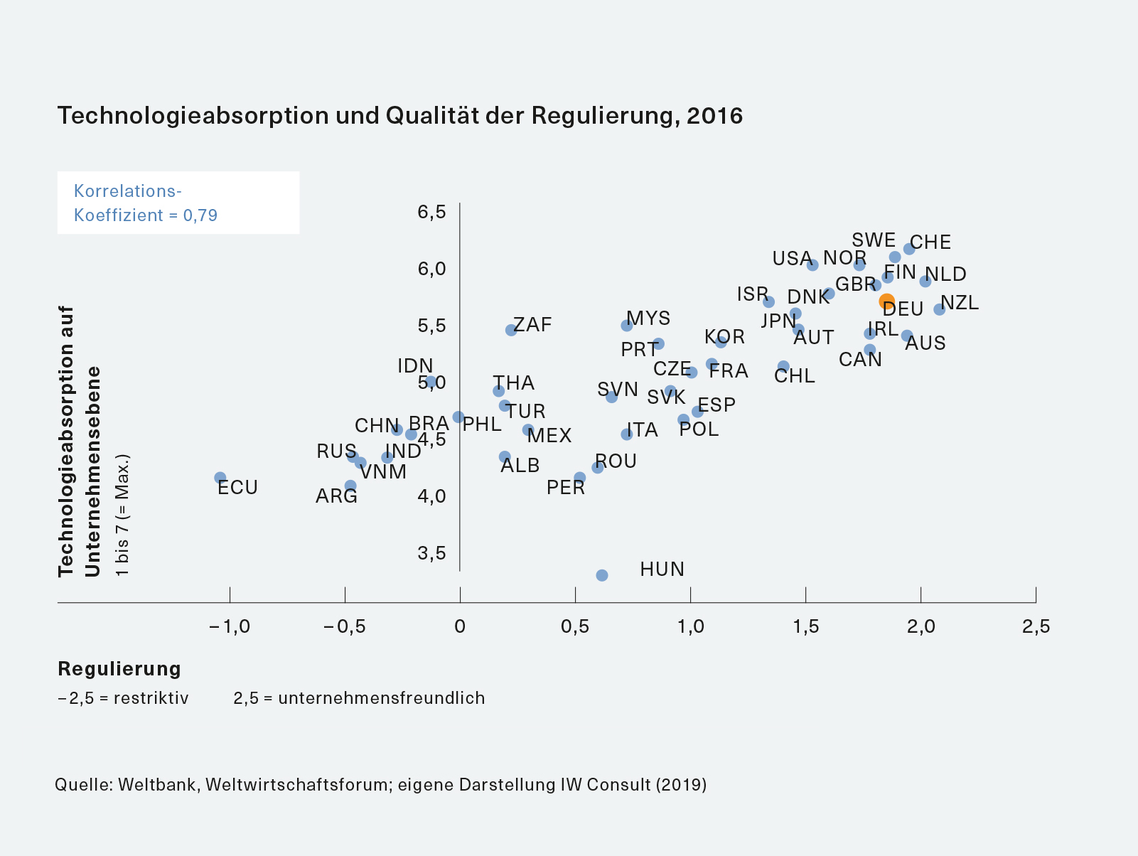 Auch die Fähigkeit von Unternehmen, neue Technologien auszuprobieren und einzusetzen, ist ein Indikator für das Innovationspotenzial einer Volkswirtschaft. Dies misst der Technology Absorption-Index des Weltwirtschaftsforums. Er misst die Fähigkeit der Unternehmen in einer Volkswirtschaft, neue Technologien einzuführen und anzuwenden. Dieser Indikator mit einer Skala von 1 (gar nicht) bis 7 (extensiv) hat eine hohe positive Korrelation mit dem Regulierungsindex (vgl. Abbildung). Somit können Unternehmen in Ländern mit unternehmensfreundlicher Regulierung neue Technologien tendenziell besser aufgreifen und implementieren als Unternehmen, die in einem restriktiven Regulierungsumfeld agieren.