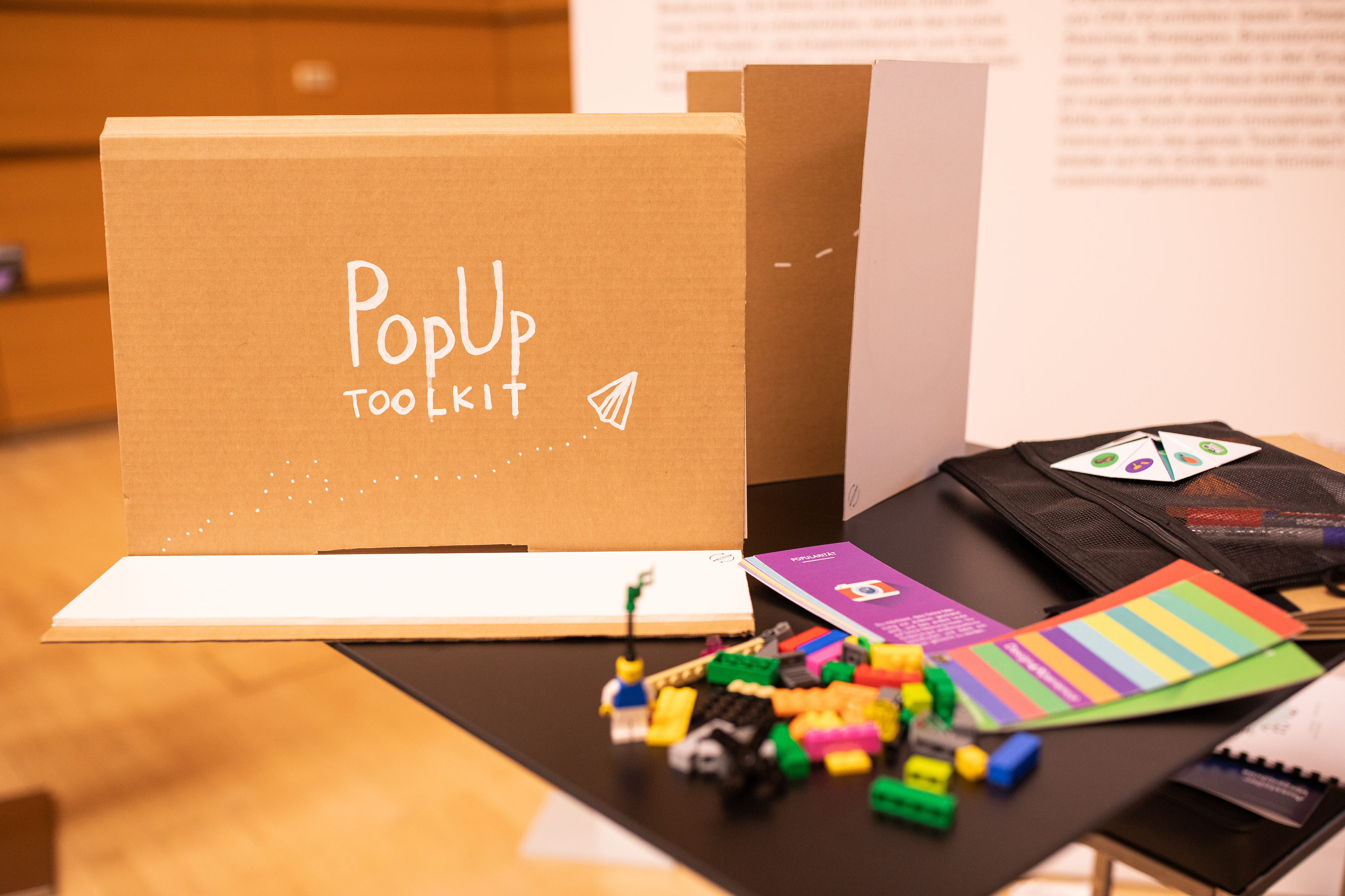 Das PopUp Toolkit ist ein Kreativitätsraum en miniature. Es passt in eine kleine Tasche, wodurch sich jederzeit und überall die typischen Funktionen eines Kreativraums nutzen lassen. Es enthält diverse mehrfach beschreibbare Mini-Whiteboards, die sich bis zu ca. einer Fläche von DIN A3 entfalten lassen. Diese können für Sketches, Strategien, Brainstormings etc. auf vielfältige Weise allein oder in der Gruppe verwendet werden. Darüber hinaus enthält das PopUP Tool-kit ergänzende Kreativmaterialien wie Post-its, Stifte etc. Durch einen innovativen Klapp-Mechanismus kann das ganze Toolkit nach Gebrauch wieder auf die Größe eines dünnen Leitz-Ordners zusammengefaltet werden.