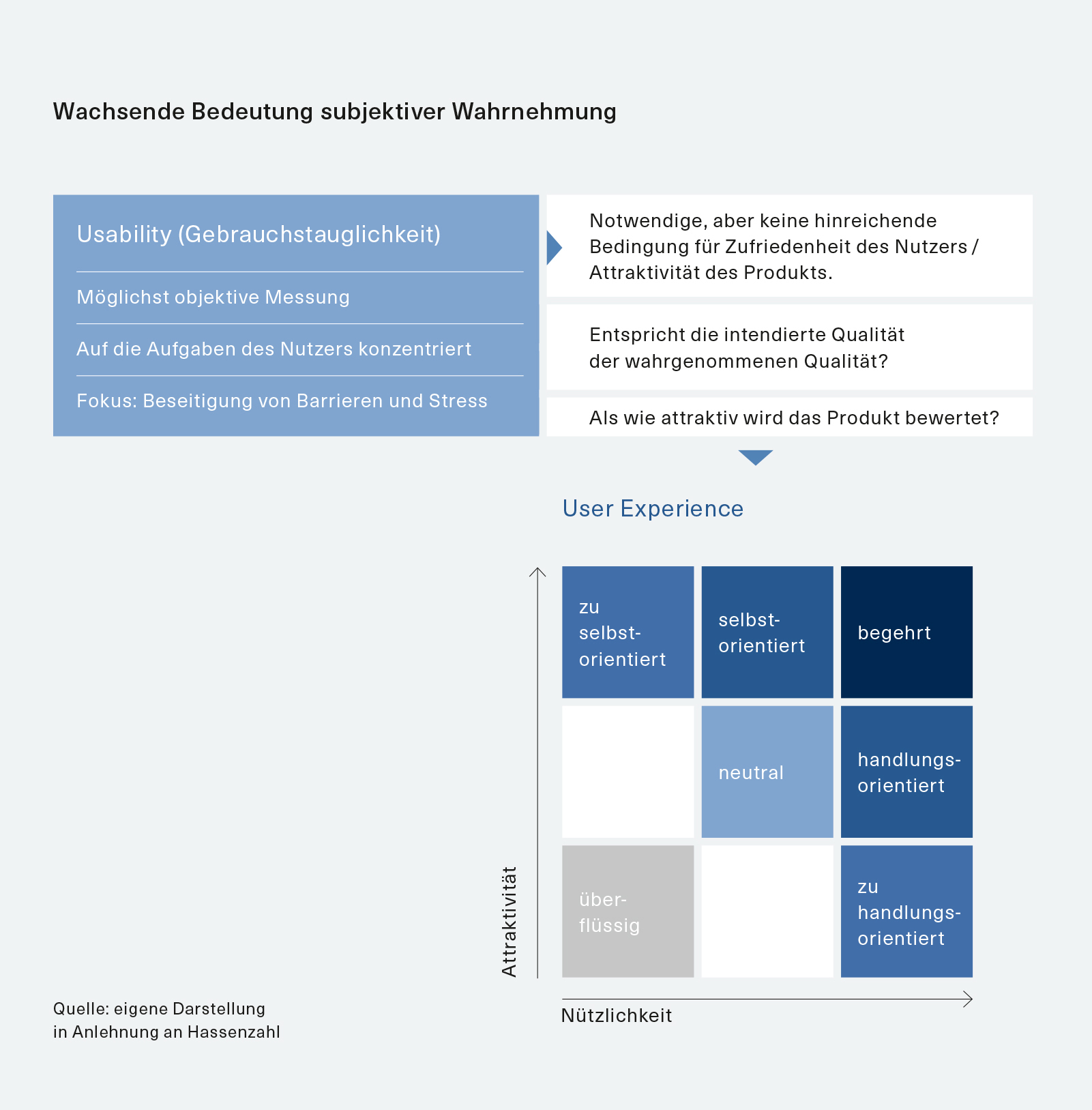 Die Basis- und Performance-Faktoren werden dabei maßgeblich durch die Gebrauchstauglichkeit (Usability) abgedeckt. Die Excitement- Faktoren sind es dagegen, die dem Anbieter eine Differenzierung ermöglichen. Diese Faktoren lassen sich nur teilweise objektiv ermitteln; vielfach ist die subjektive Wahrnehmung durch den Kunden entscheidend (vgl. Abbildung Ausklapper 1). Sie bestimmt letztlich, ob er das Produkt als attraktiv empfindet und entsprechend disponiert.