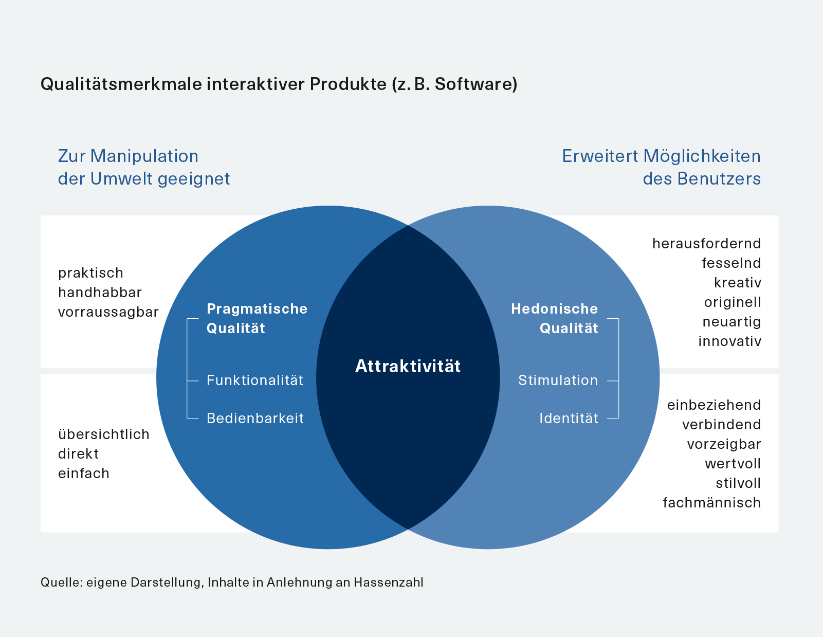 Für die Messung der Attraktivität hat sich daher eine neue Herangehensweise etabliert (vgl. Abbildung unten), die deutlich stärker auf subjektive Elemente setzt. Letztlich geht es dabei um eine Kombination aus müheloser Durchführung (pragmatische Qualität) und psychologischer Motivation (hedonische Qualität).