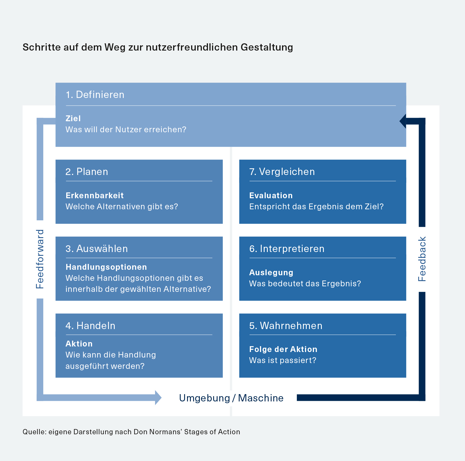 Elementar ist dabei, die Bedienungsmöglichkeiten so zu gestalten, dass der Nutzer ein Verständnis von den Zusammenhängen entwickeln kann, damit die Interaktion mühelos möglich wird. Dabei muss es sich nicht um ein physikalisch exaktes Abbild dieser Zusammenhänge handeln, eine schlüssige Näherung ist ausreichend. Aus den dargestellten Handlungsstufen leiten sich Grundregeln für gutes Design ab (in Anlehnung an Don Norman):