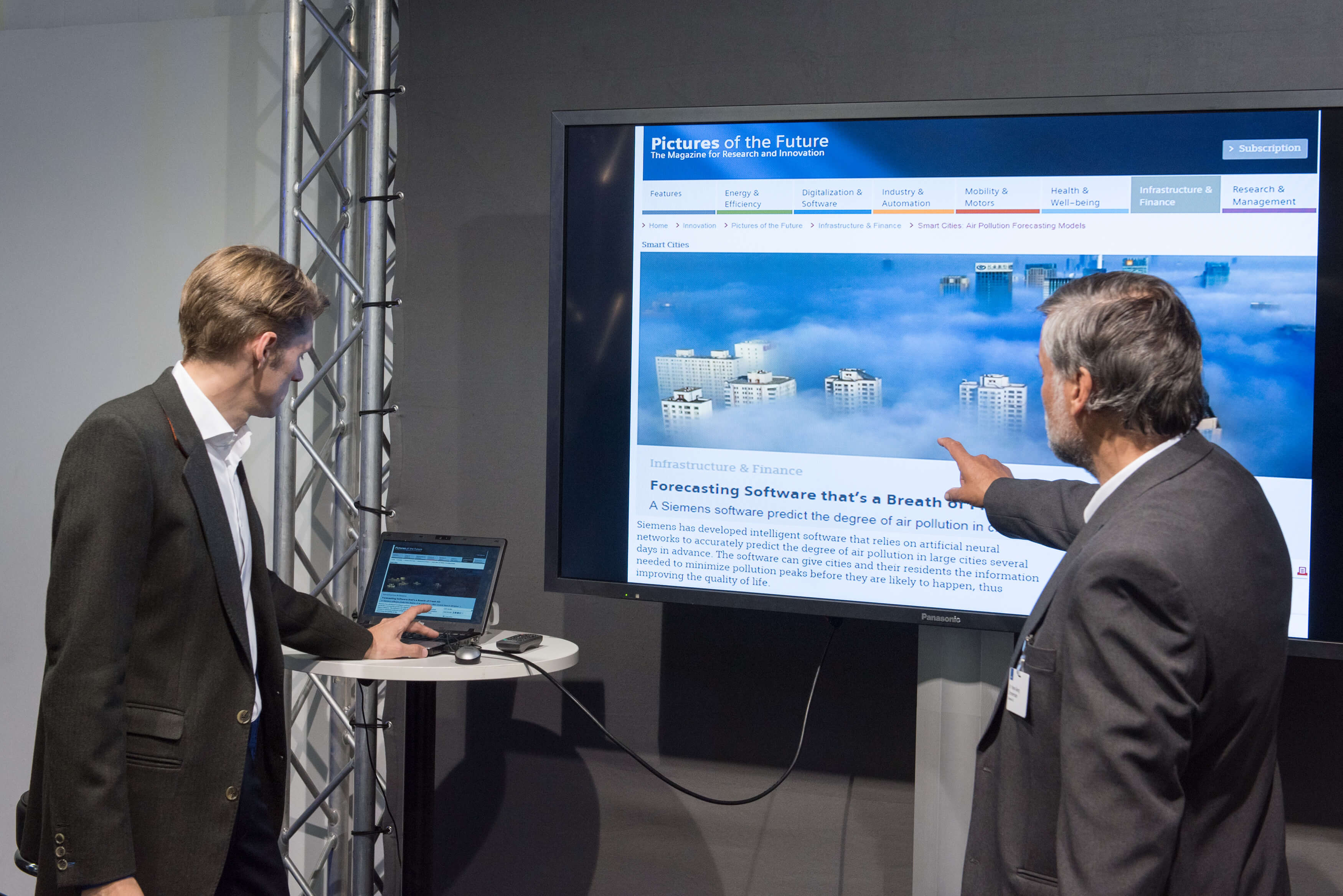 Weniger Emissionen im Straßenverkehr können die Luftqualität verbessern. Städte können dies erreichen, indem sie Staus durch intelligente Verkehrslösungen vermeiden oder das zu Fuß gehen oder Rad fahren attraktiver machen – dort wo die Luftverschmutzung am größten ist. Dazu müssen die Behörden den Verlauf der Schadstoffbelastung kennen. Modelle auf der Basis sogenannter Deep Neural Networks können verschiedene Emissionen vorhersagen. Das Exponat zeigt die Prognose