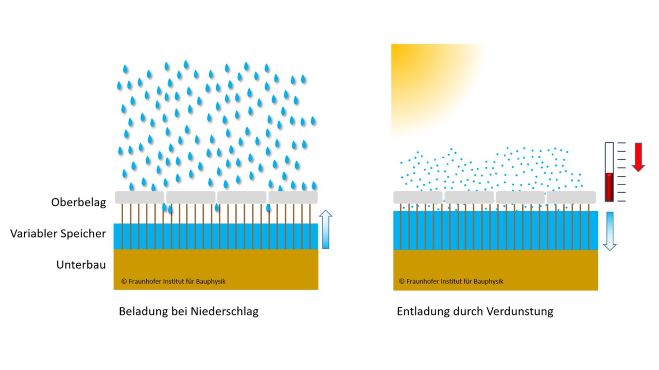 In einem anderen Projekt wurde ein Wasserspeicher in Pflastersteine integriert. Das eingelagerte Wasser wird im Hochsommer an die Steinoberfläche transportiert und kühlt diese durch Verdunstungsenthalpie ab. So soll einerseits eine mögliche Wärmeeinlagerung in die Betonschicht gleich bei der Entstehung verhindert werden, welche in den Abendstunden und nachts die erforderliche Auskühlung abschwächt. Andererseits wird das Behaglichkeitsempfinden bei der Nutzung und beim Aufenthalt in der Nähe versiegelter Flächen signifikant verbessert.
