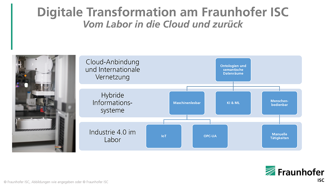 Im Zentrum steht die ontologische Beschreibung von Materialien und notwendigen Prozessketten. Davon leitet sich die Architektur des zentralen Datenraumes ab, der sowohl mit real erfassten Parametern und Analysen als auch mit Simulationsmodellen gespeist wird. Zusätzlich ermöglicht die Entwicklung modularer „Machine-Learning-Algorithmen“, bisher nicht zugängliche Zusammenhänge zwischen Ist-Parametern der Materialien und Prozesse und den Zieleigenschaften herzustellen. Das Fraunhofer ISC bietet hierzu projektbezogen Unterstützung bei Aufbau und Implementierung an.