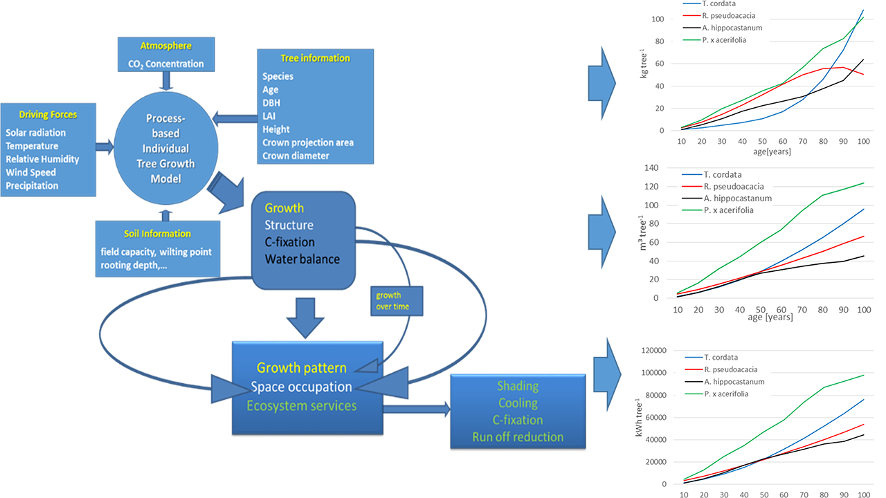 insbesondere die Kohlenstoffspeicherung und Kühlung durch Beschattung und Transpiration – von Bäumen, Sträuchern und Rasenflächen an ausgewählten Plätzen in München bestimmt und die Wirkung auf das thermische Wohlbefinden des Menschen dargestellt. Darüber hinaus werden anhand von Simulationen des Mikroklimas, des Pflanzenwachstums und der Ökosystemleistungen verschiedene Gestaltungsszenarien von öffentlichen Plätzen im Hinblick auf die Klimaanpassung aufgezeigt. Diese Erkenntnisse werden im Kontext der Ökosystemdienstleistungen der Vegetation und des thermischen Wohlbefindens der Menschen bewertet.