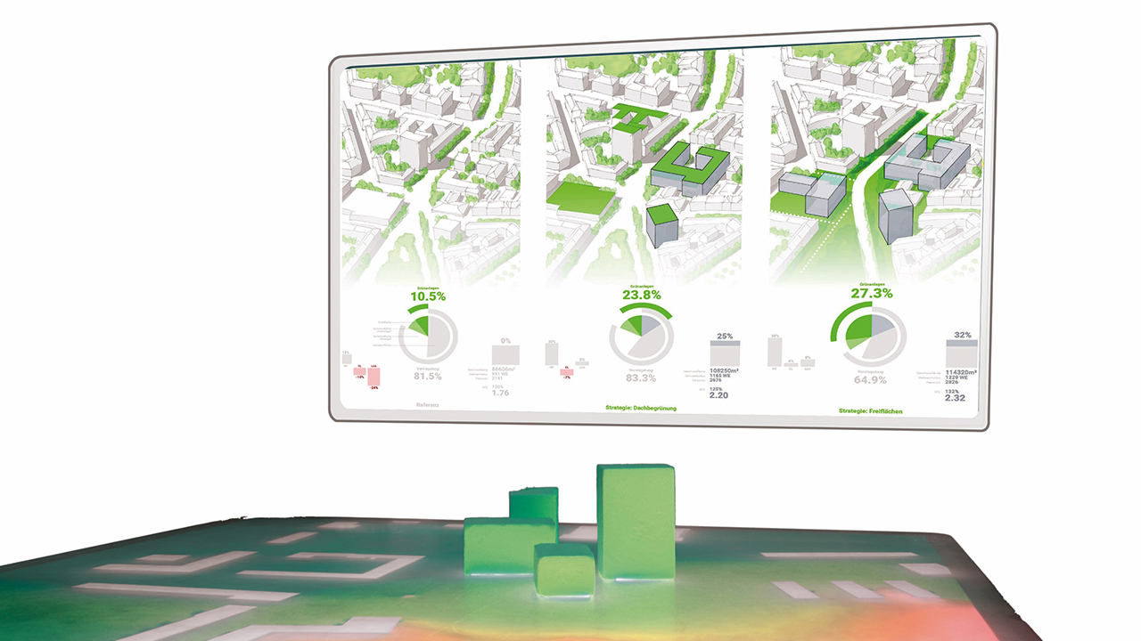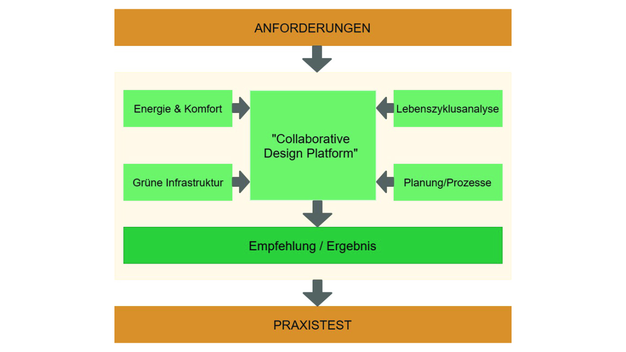 Das Projekt entwickelt ein Modellierungs- und Visualisierungswerkzeug für die Quantifizierung von Auswirkungen unterschiedlicher Szenarien der baulichen Nachverdichtung. Dabei kommt der Integration von Grünmaßnahmen sowohl an Gebäuden als auch im Außenraum eine besondere Bedeutung zu. Durch die Erfassung von Szenarien und deren Echtzeitsimulation über die „Collaborative Design Platform“ wird die Entscheidungsfindung bei Nachverdichtungsvorhaben unterstützt. Dies fördert die Integration von Klimaschutz (Energiebedarf, Emissionen) und Klimaanpassung (Mikroklima, thermischer Komfort im Außenraum) u.a. in der Bebauungsplanung und Freiraumgestaltung.