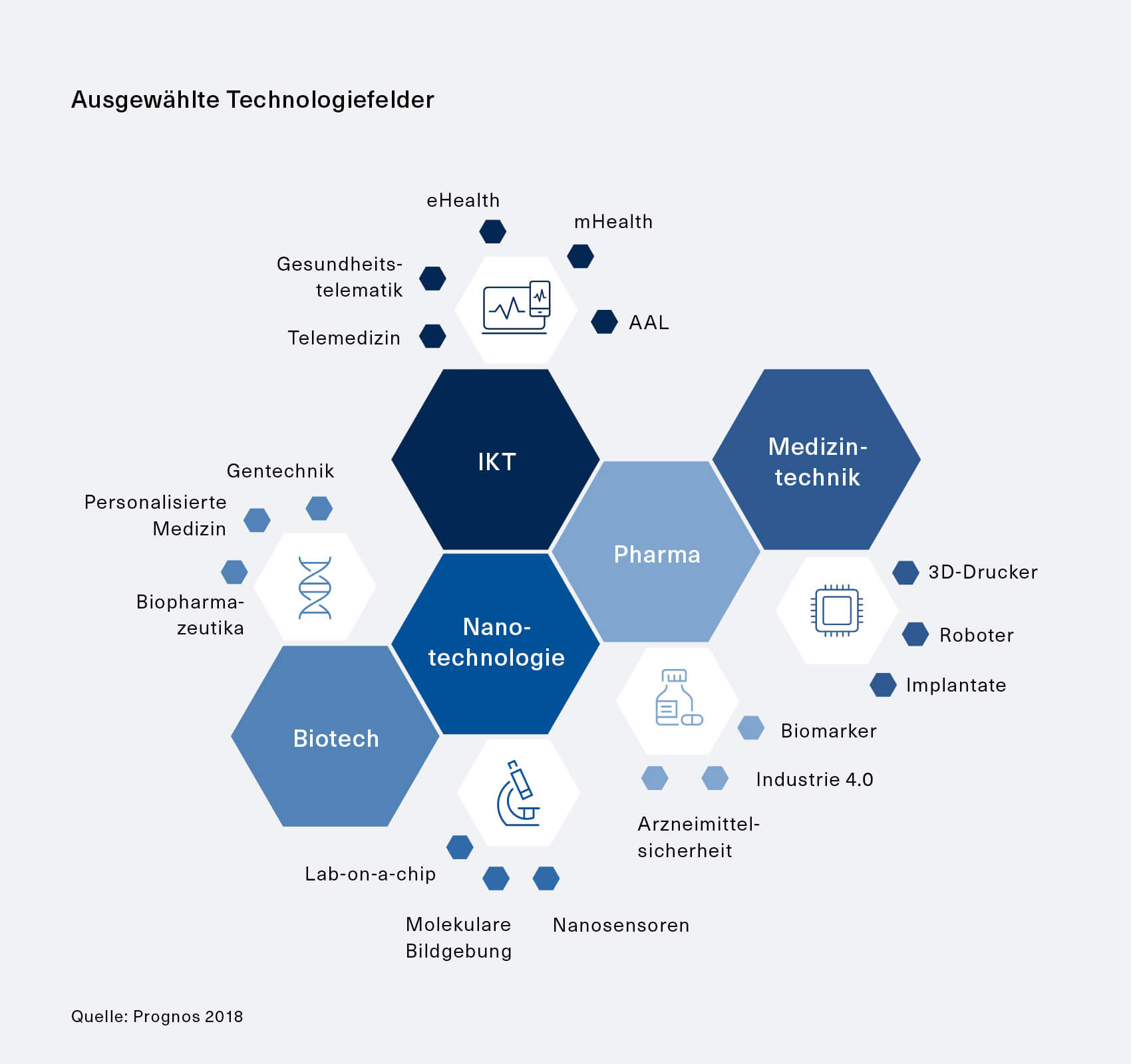 Eine weitere Schlüsseltechnologie mit enormem Potenzial ist die Medizintechnik. Ein besonders wichtiges Feld ist die Robotik. Assistenzroboter oder Personenlifter unterstützen Pflegekräfte und Ärzte schon heute, langfristig ist auch denkbar, dass Roboter künftig nicht nur technische Hilfestellung leisten, sondern auch bei sozialen Aufgaben ergänzend zum Einsatz kommen. Im Operationssaal kommen robotische Assistenzsysteme z. B. bei minimalinvasiven Eingriffen zum Einsatz, bei denen äußerst kleine Schnitte in höchster Präzision ausgeführt werden müssen.