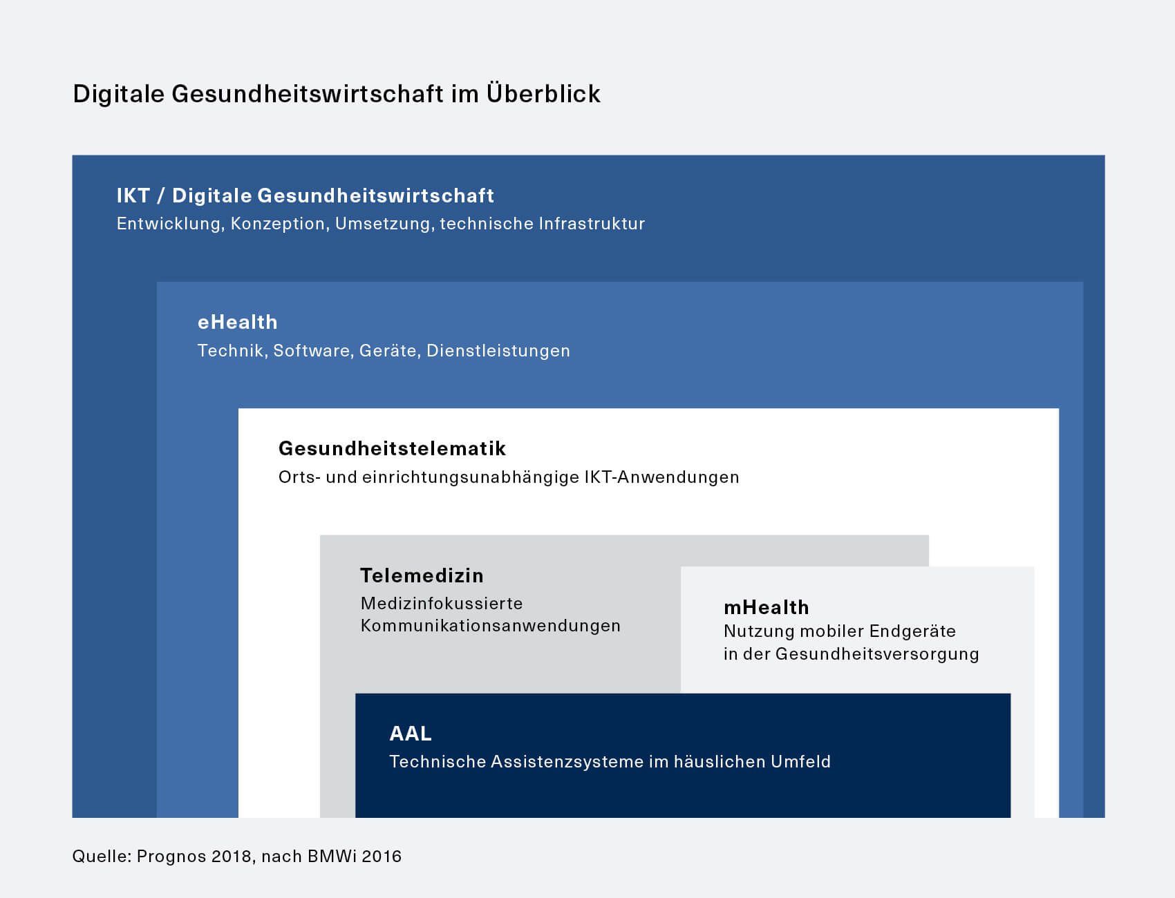 Innovationen aus dem Bereich der Informations- und Kommunikationstechnik werden im Gesundheitswesen unter dem Begriff der digitalen Gesundheitswirtschaft zusammengefasst und umfassen fünf ineinander verschränkte Anwendungsfelder. Dabei bildet eHealth den Oberbegriff für ein breites Spektrum von IKT-gestützten elektronischen Anwendungen im Gesundheitswesen:
