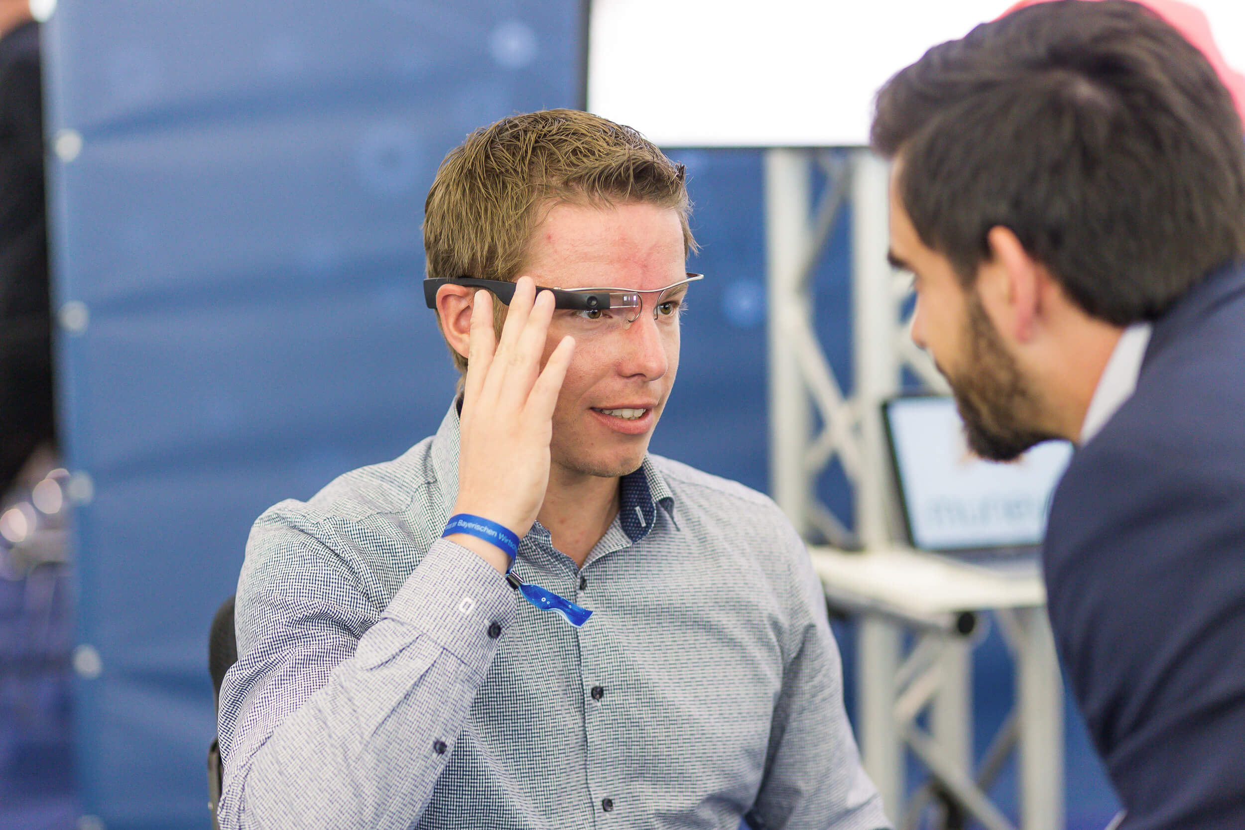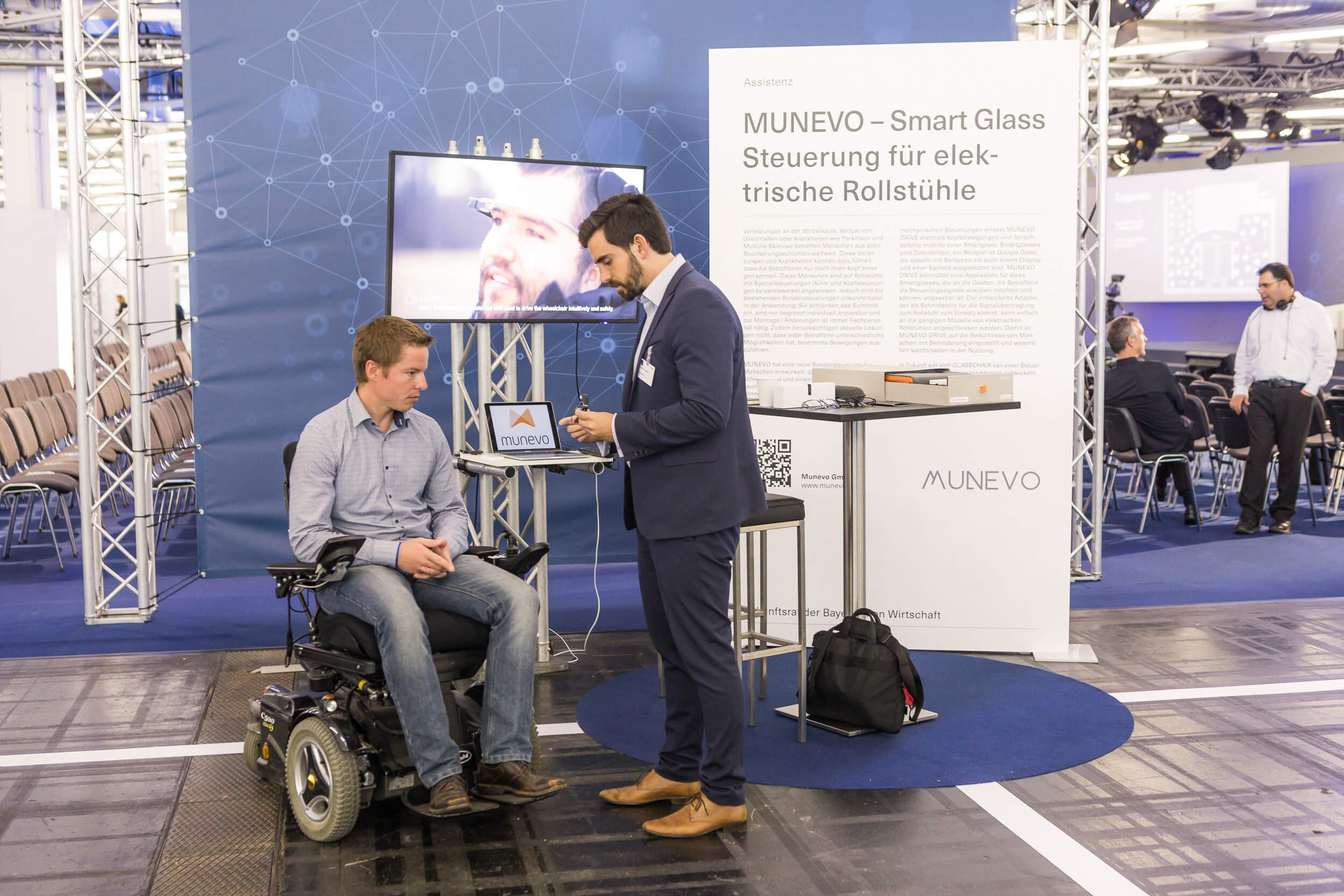 Verletzungen an der Wirbelsäule, Verlust von Gliedmaßen oder Krankheiten wie Parkinson und Multiple Sklerose betreffen Menschen aus allen Bevölkerungsschichten weltweit. Diese Verletzungen und Krankheiten können dazu führen, dass die Betroffenen nur noch ihren Kopf bewegen können. Diese Menschen sind auf Rollstühle mit Spezialsteuerungen (Kinn- und Kopfsteuerungen beispielsweise) angewiesen. Jedoch sind die bestehenden Sondersteuerungen unkomfortabel in der Anwendung: Sie schränken das Sichtfeld ein, sind nur begrenzt individuell anpassbar und zur Montage / Änderungen ist immer Fachpersonal nötig. Zudem berücksichtigen aktuelle Lösungen nicht, dass jeder Betroffene unterschiedliche Möglichkeiten hat, bestimmte Bewegungen auszuführen. MUNEVO hat eine neue Sondersteuerung für Menschen entwickelt, die körperlich eingeschränkt sind und einen elektrischen Rollstuhl kaum oder nicht auf konventionelle Art steuern können. Im Gegensatz zu etablierten, meist rein mechanischen Steuerungen erfasst MUNEVO DRIVE erstmals Kopfbewegungen und Sprachbefehle mithilfe einer Smartglass. Smartglasses sind Datenbrillen, ein Beispiel ist Google Glass, die sowohl mit Sensoren als auch einem Display und einer Kamera ausgestattet sind. MUNEVO DRIVE beinhaltet eine Applikation für diese Smartglasses, die an die Gesten, die Betroffene als Steuerungssignale ausüben möchten und können, anpassbar ist. Der entwickelte Adapter, der als Schnittstelle für die Signalübertragung zum Rollstuhl zum Einsatz kommt, kann einfach an die gängigen Modelle von elektrischen Rollstühlen angeschlossen werden. Damit ist MUNEVO DRIVE auf die Bedürfnisse von Menschen mit Behinderung eingestellt und wesentlich komfortabler in der Nutzung. In Zukunft soll sich GLASSCHAIR von einer Steuerungslösung zum Alltagsassistenten entwickeln.