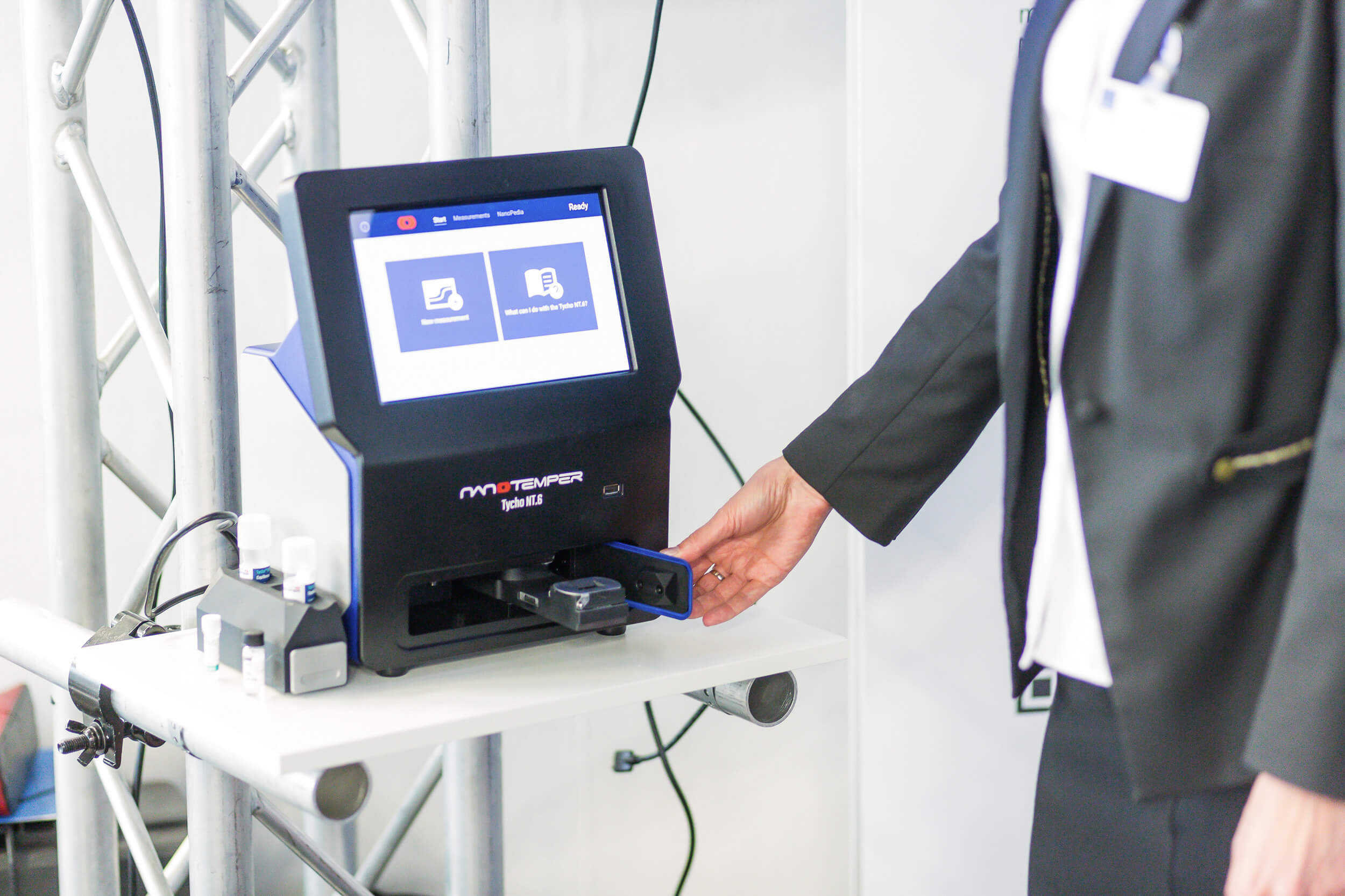 Biotechnologisch hergestellte Medikamente wie das Krebsmedikament Herceptin® sind eine der vielversprechendsten Wirkstoffklassen in der Medizin. Diese auch Biopharmazeutika oder Biologicals genannten Biomoleküle sind bis zu 1000-mal komplexer als herkömmliche Medikamente wie zum Beispiel Aspirin®. Es sind deswegen neue Verfahren und physikalische Messmethoden notwendig, um diese Biomoleküle zu entwickeln und bei deren Herstellung die Qualität zu überwachen. Für diesen Anwendungsbereich hat die NanoTemper Technologies GmbH das Labormessgerät Tycho® NT.6 entwickelt. Im Tycho® NT.6 wird ein innovatives nano-optisches Messverfahren eingesetzt, um in einem Schritt die Qualität dieser hochkomplexen Biopharmazeutika zu untersuchen. Mit einem winzigen, nur wenige Mikroliter großen Tropfen der Probe erfahren die Forscher innerhalb drei Minuten, ob ein vorliegendes Biopharmazeutikum ihren Erwartungen entspricht. Dabei wird der Forscher von einer intelligenten Software des Messgeräts unterstützt, die über einen sog. „Similarity Index“ unterschiedliche Moleküle miteinander vergleicht. Auf einen Blick kann der Forscher z. B. ein originales Biopharmazeutikum mit seiner Kopie, einem Biosimilar, vergleichen und auch voneinander unterscheiden. Derzeit wird der Tycho® NT.6 noch hauptsächlich im Bereich der Medikamentenforschung und Formulierungsentwicklung eingesetzt. Geringer Probeverbrauch, schnelle Messungen, intelligente Software und leichte Bedienbarkeit ermöglichen den Forschern, sich auf ihre Berufung, die Entwicklung von hochwertigen Medikamenten, zu konzentrieren.