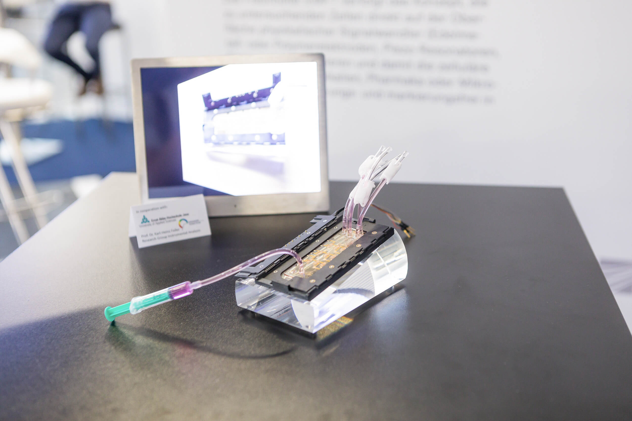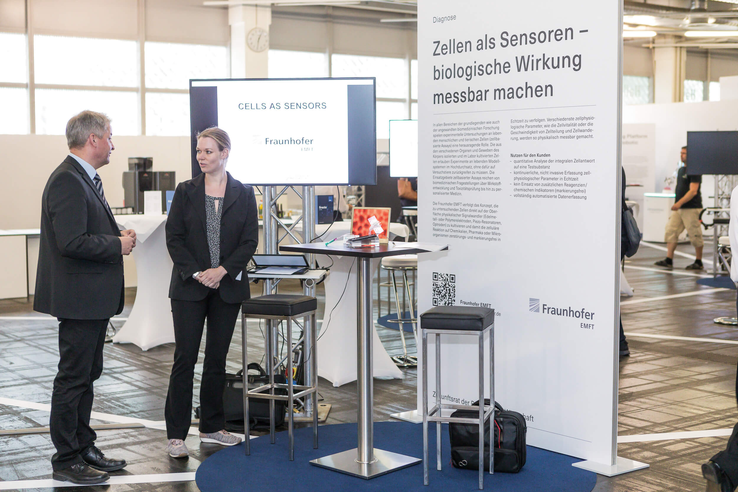 In allen Bereichen der grundlegenden wie auch der angewandten biomedizinischen Forschung spielen experimentelle Untersuchungen an lebenden menschlichen und tierischen Zellen (zellbasierte Assays) eine herausragende Rolle. Die aus den verschiedenen Organen und Geweben des Körpers isolierten und im Labor kultivierten Zellen erlauben Experimente an lebenden Modellsystemen im Hochdurchsatz, ohne dafür auf Versuchstiere zurückgreifen zu müssen. Die Einsatzgebiete zellbasierter Assays reichen von biomedizinischen Fragestellungen über Wirkstoffentwicklung und Toxizitätsprüfung bis hin zu personalisierter Medizin.Die Fraunhofer EMFT verfolgt das Konzept, die zu untersuchenden Zellen direkt auf der Oberfläche physikalischer Signalwandler (Edelmetall- oder Polymerelektroden, Piezo-Resonatoren, Optroden) zu kultivieren und damit die zelluläre Reaktion auf Chemikalien, Pharmaka oder Mikroorganismen zerstörungs- und markierungsfrei in Echtzeit zu verfolgen. Verschiedenste zellphysiologische Parameter, wie die Zellvitalität oder die Geschwindigkeit von Zellteilung und Zellwanderung, werden so physikalisch messbar gemacht.