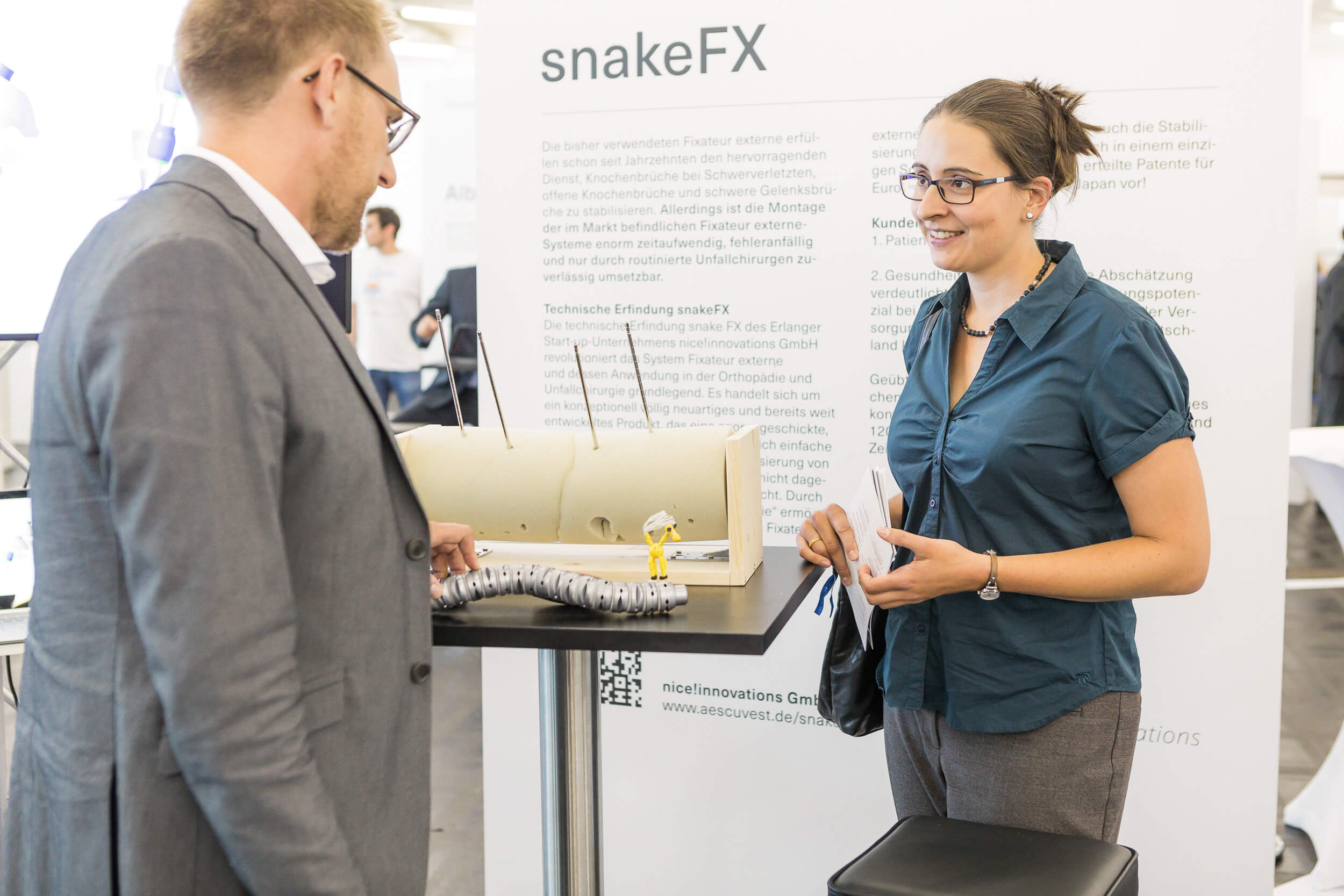 Die technische Erfindung snake FX des Erlanger Start-up-Unternehmens nice!innovations GmbH revolutioniert das System Fixateur externe und dessen Anwendung in der Orthopädie und Unfallchirurgie grundlegend. Es handelt sich um ein konzeptionell völlig neuartiges und bereits weit entwickeltes Produkt, das eine enorm geschickte, schnelle und einfache und dadurch fehlerverzeihende Stabilisierung von Knochenbrüchen mittels eines bisher nicht dagewesenen „Schlangenprinzips“ ermöglicht. Durch die „One-step-rapid-fixation-Technologie“ ermöglicht snakeFX sowohl die Fixierung des Fixateur externe an den Knochen-Pins als auch die Stabilisierung des Fixateur externe in sich in einem einzigen Schritt.