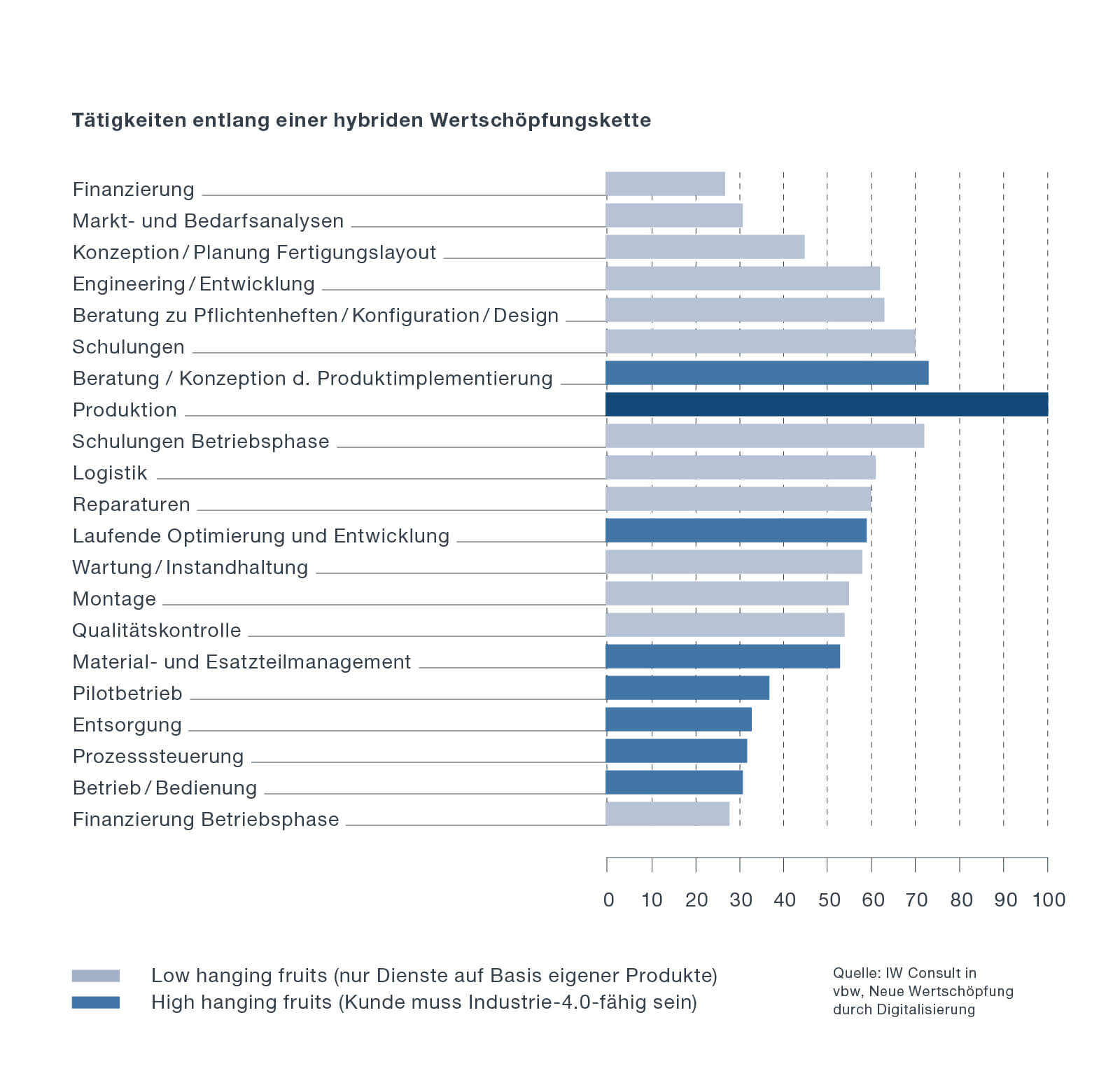 Die Verlängerung der Wertschöpfungskette durch die Ergänzung des Produkts um vor- und nachgelagerte Dienstleistungen (sogenannte hybride Wertschöpfung) ist grundsätzlich auch ohne Digitalisierung denkbar, diese verleiht den entsprechenden Geschäftsmodellen jedoch insbesondere im Hinblick auf die Verfügbarkeit von Daten und die dadurch zusätzlich möglichen Leistungen (Beispiel Predictive Maintenance) eine ganz neue Dynamik.