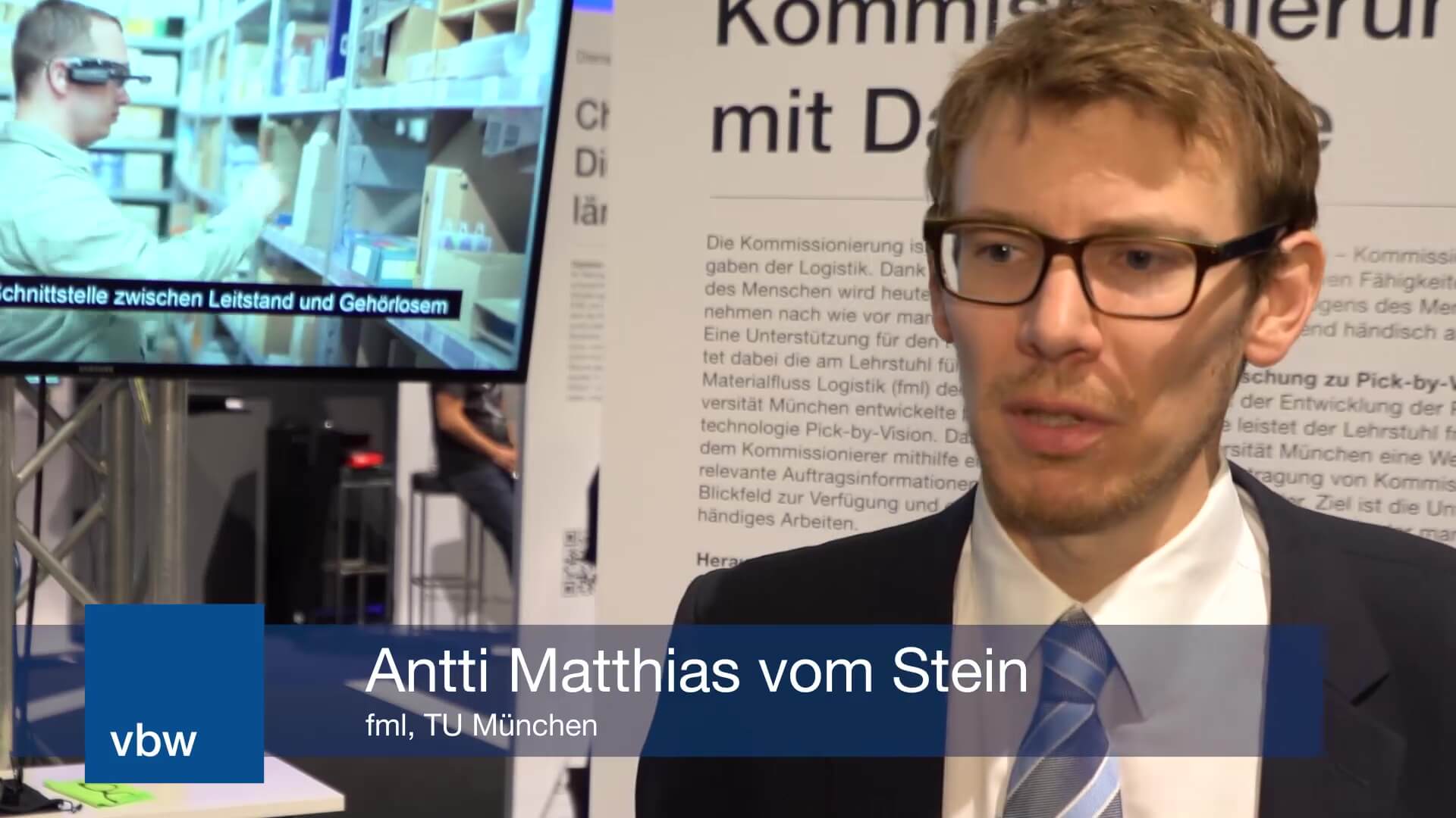 Die Kommissionierung ist eine der zentralen Aufgaben der Logistik. Dank der hohen Flexibilität des Menschen wird heute in zahlreichen Unternehmen nach wie vor manuell kommissioniert. Eine Unterstützung für den Kommissionierer bietet dabei die am Lehrstuhl für Fördertechnik Materialfluss Logistik (fml) der Technischen Universität München entwickelte Kommissioniertechnologie Pick-by-Vision. Das System stellt dem Kommissionierer mithilfe einer Datenbrille relevante Auftragsinformationen direkt in dessen Blickfeld zur Verfügung und ermöglicht ein freihändiges Arbeiten.