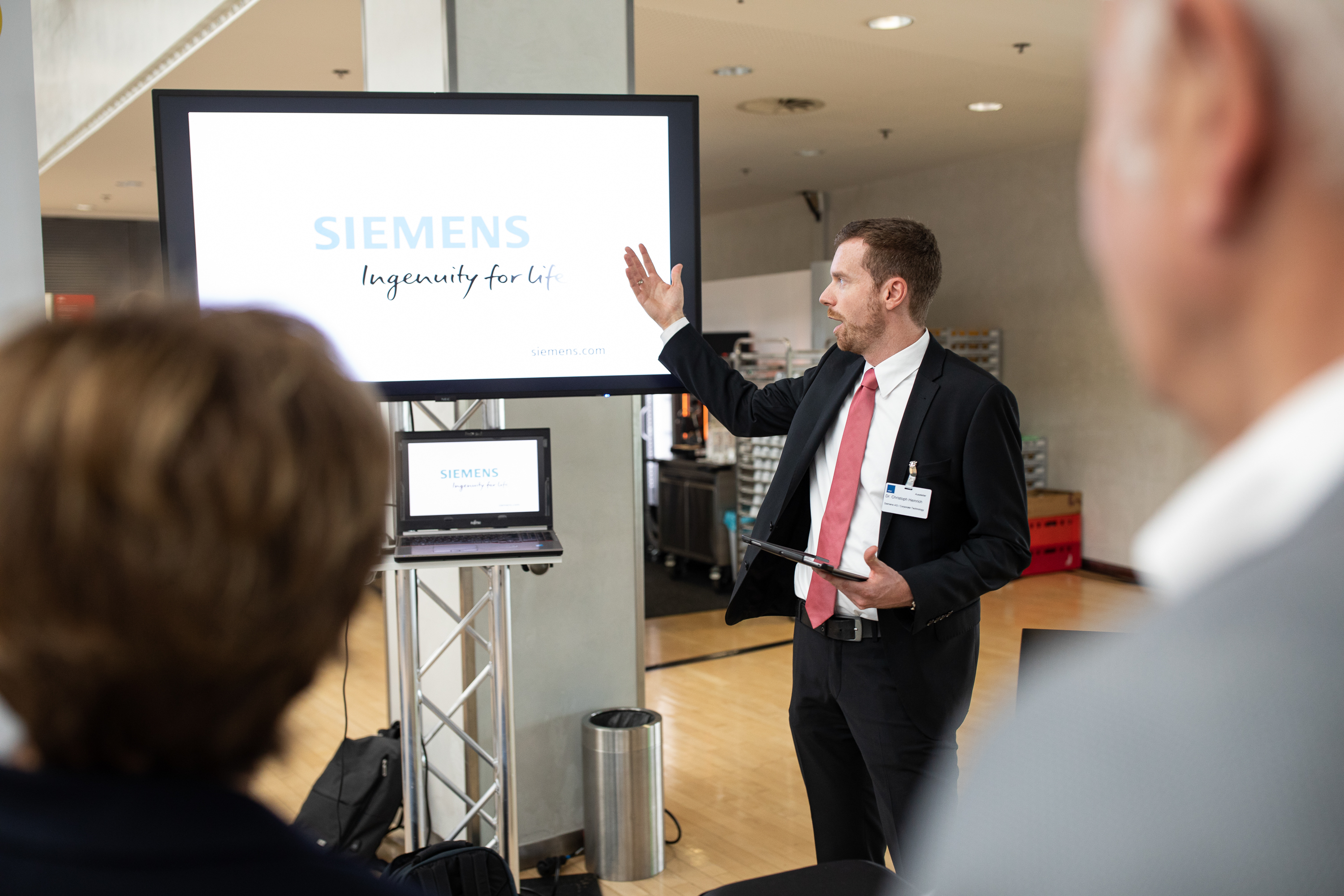 Die Applikation kombiniert drei topaktuelle technologische Trends: das Internet der Dinge, den Digitalen Zwilling und Augmented Reality (AR). Dazu wurde von Corporate Technology ein Prüf-stand mit zwei elektrischen Motoren inklusive zusätzlicher Sensoren aufgebaut. Die Sensordaten werden in Echtzeit auf die Siemens-Cloud-Plattform MindSphereübertragen. Sie enthält ebenfalls einen komplexen, von Siemens-Experten entwickelten echtzeitfähigen Digitalen Zwilling der Motoren. Dieser Digitale Zwilling wird wiederum mit den Sensordaten über MindSphere verbunden, sodass der Zustand der Motoren online ermittelt und das nächste Wartungsintervall, basierend auf den aktuellen und zukünftigen Betriebsbedingungen, prognostiziert werden kann.