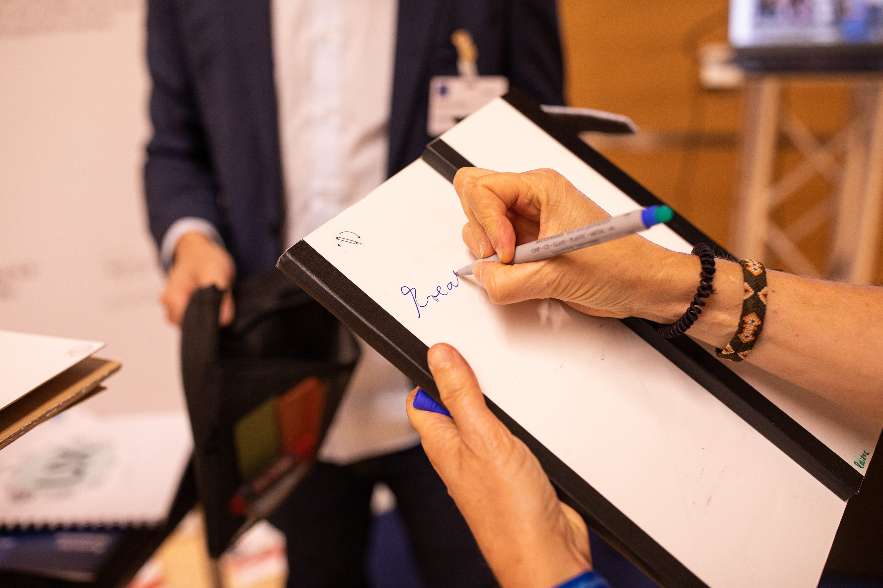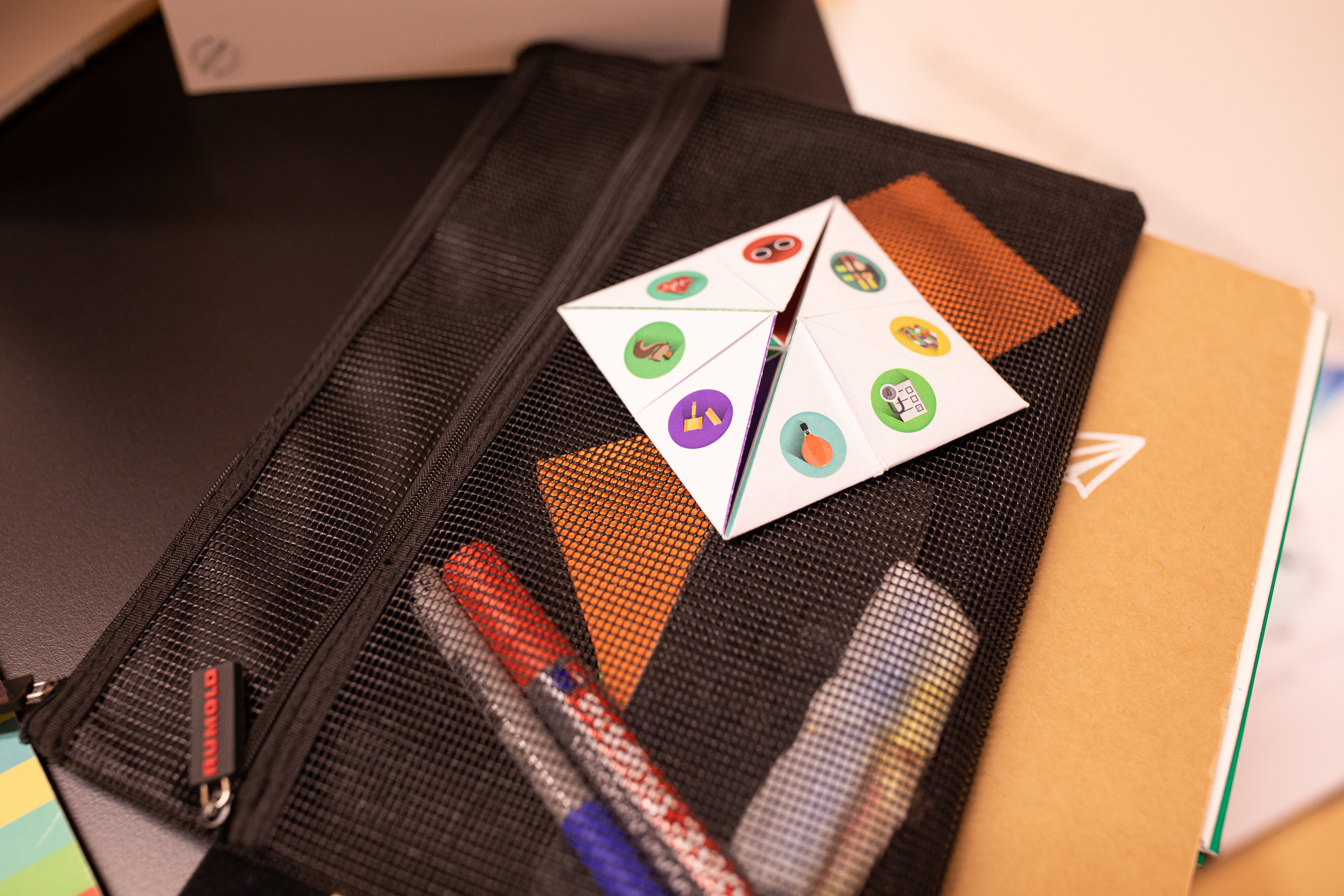 Das PopUp Toolkit ist ein Kreativitätsraum en miniature. Es passt in eine kleine Tasche, wodurch sich jederzeit und überall die typischen Funktionen eines Kreativraums nutzen lassen. Es enthält diverse mehrfach beschreibbare Mini-Whiteboards, die sich bis zu ca. einer Fläche von DIN A3 entfalten lassen. Diese können für Sketches, Strategien, Brainstormings etc. auf vielfältige Weise allein oder in der Gruppe verwendet werden. Darüber hinaus enthält das PopUP Tool-kit ergänzende Kreativmaterialien wie Post-its, Stifte etc. Durch einen innovativen Klapp-Mechanismus kann das ganze Toolkit nach Gebrauch wieder auf die Größe eines dünnen Leitz-Ordners zusammengefaltet werden.