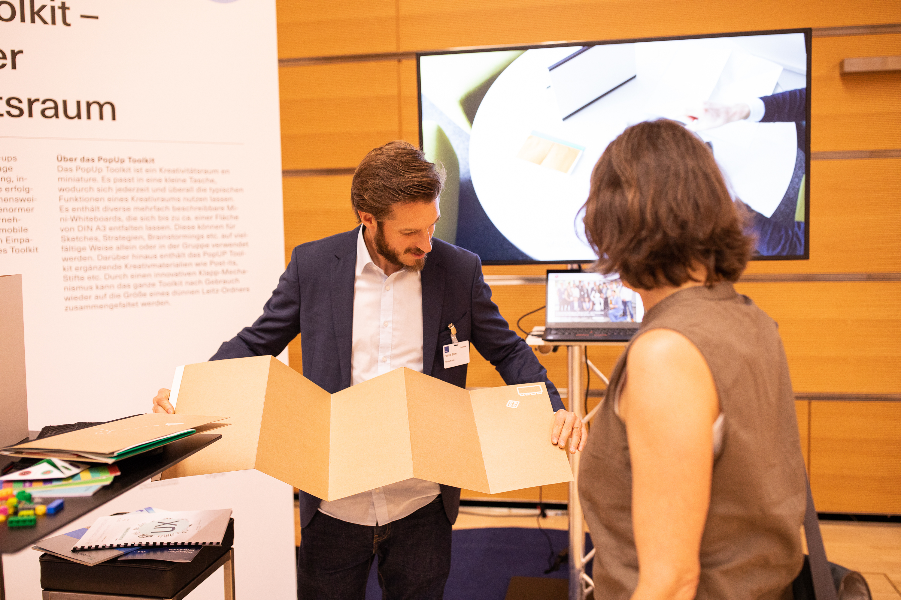 Mittelständische Unternehmen und Start-ups stehen genau wie die großen Player im Zuge der Digitalisierung vor der Herausforderung, innovative Produkte zu entwickeln. Für eine erfolgreiche Innovation sind die richtige Vorgehensweise und das entsprechende Mindset von enormer Bedeutung. Um kleine und mittlere Unternehmen hierbei zu unterstützen, wurde das mobile PopUP Toolkit – ein Kreativitätsraum zum Einpacken und Mitnehmen – entwickelt. Dieses Toolkit kann kostenlos entliehen werden.