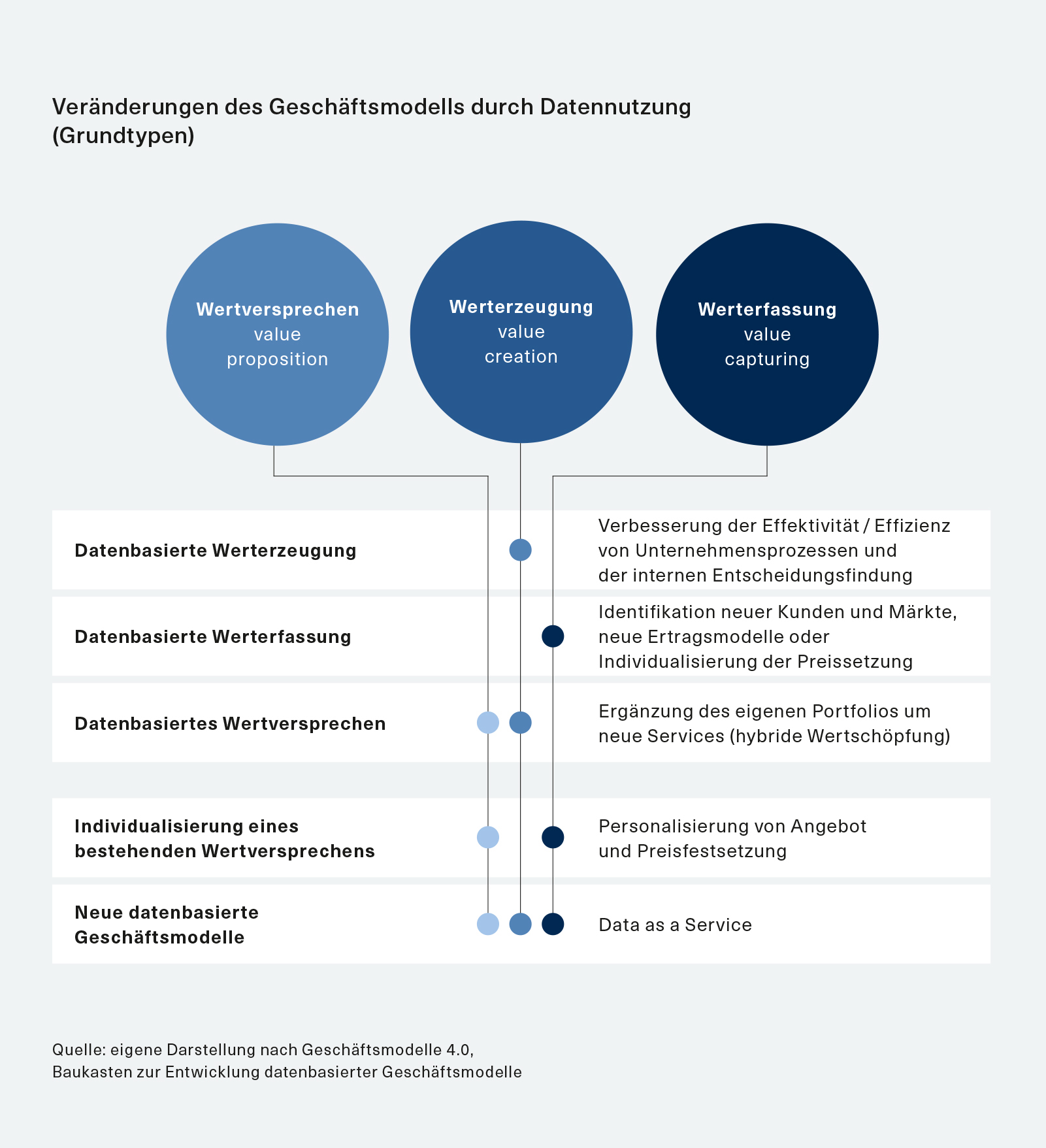 Getrieben vor allem durch die digitale Transformation spielen neue Geschäftsmodelle neben Innovationen bei physischen Produkten eine zunehmend wichtige Rolle. In früheren Handlungsempfehlungen wurde bereits betont, dass jedes Unternehmen seine eigene Digitalisierungsstrategie und Datenstrategie benötigt. Sie sind Grundlagen für die Entwicklung neuer Geschäftsmodelle. Erster Schritt muss dabei immer eine Analyse der heutigen und möglichen künftigen Leistungsbeziehungen sein.