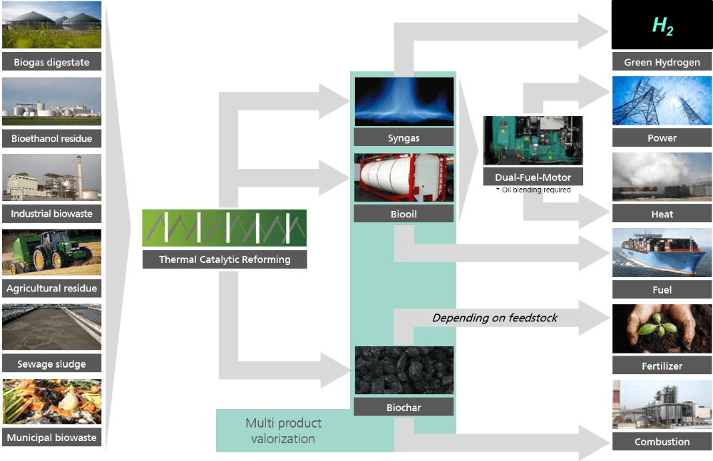 Das Verfahren erlaubt die Verarbeitung verschiedener Einsatzstoffe wie Land- und forstwirtschaftliche Reststoffe, Klärschlamm, Bioabfall oder Rückstände aus der Nahrungsmittelproduktion mit einer einheitlichen Reaktortechnik. In einem mehrstufigen thermo-chemischen Prozess wird die eingesetzte Biomasse in Synthesegas, Biokohle und Bioöl umgewandelt.